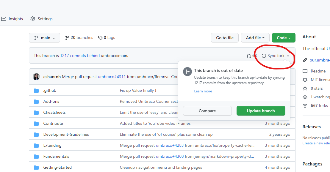 * Use the **Sync fork** option when your fork is behind the original repository.