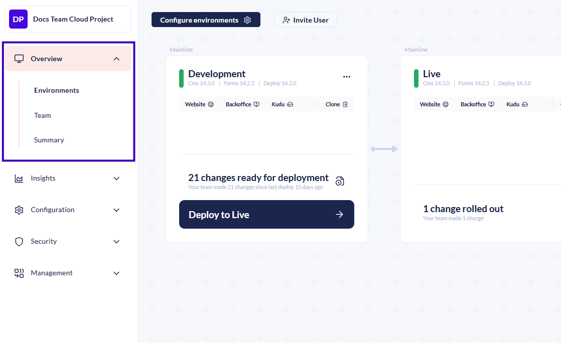 * A place to manage the [**Environments**](https://docs.umbraco.com/umbraco-cloud/build-and-customize-your-solution/handle-deployments-and-environments/manage-environments) on your project.