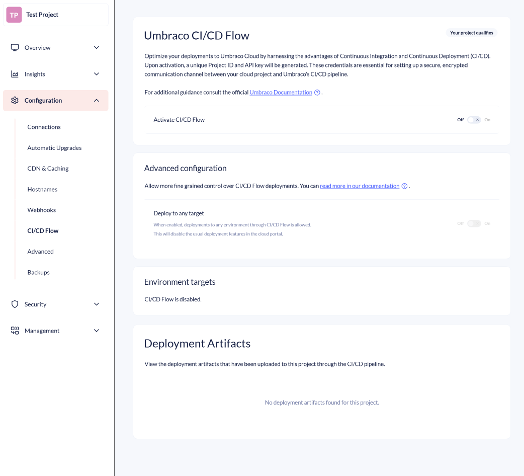 <figure><img src="https://3739769070-files.gitbook.io/~/files/v0/b/gitbook-x-prod.appspot.com/o/spaces%2FPzKn70Piyd2fd5UkYZGf%2Fuploads%2Fgit-blob-8963ed47ce47a32802bd9541262fc024a78bb4e7%2Fcicd-advanced-configuration.png?alt=media" alt=""><figcaption><p>"Umbraco CI/CD Flow - Advanced configuration" section showing the enabled "Deploy to any target".</p></figcaption></figure>