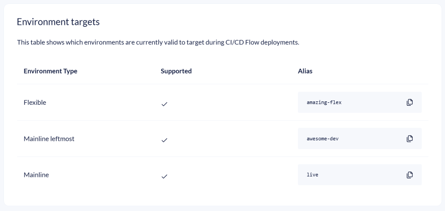 The table shows you which environments you can currently target with CI/CD Flow. The environment aliases in the tables are the ones you need. You can click the button next to the environment alias to copy it and save it for later use.
