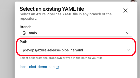 5. Select `/devops/azure-release-pipeline.yaml` in Path and continue.
