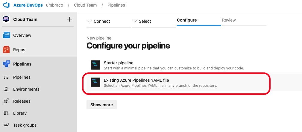 Before setting up the pipeline in Azure DevOps, make sure that the following steps from the [Configuring a CI/CD pipeline](https://docs.umbraco.com/umbraco-cloud/build-and-customize-your-solution/handle-deployments-and-environments/umbraco-cicd/samplecicdpipeline) article are complete: