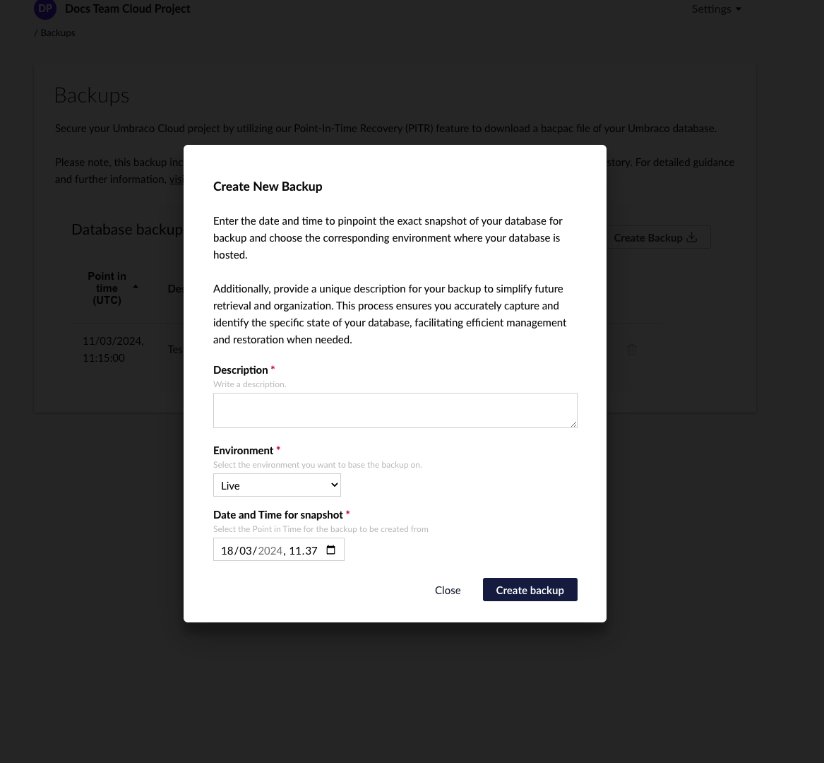 Only Project Administrators have access to the **Backups** page on Umbraco Cloud.
