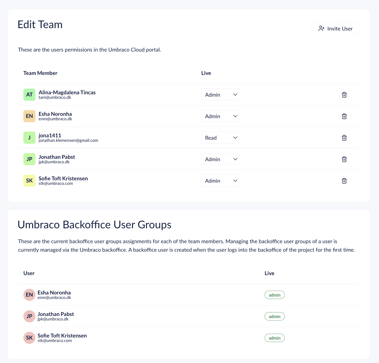 * Manage backoffice user groups and [Technical contacts](https://docs.umbraco.com/umbraco-cloud/begin-your-cloud-journey/project-features/team-members/technical-contact) for your project.
