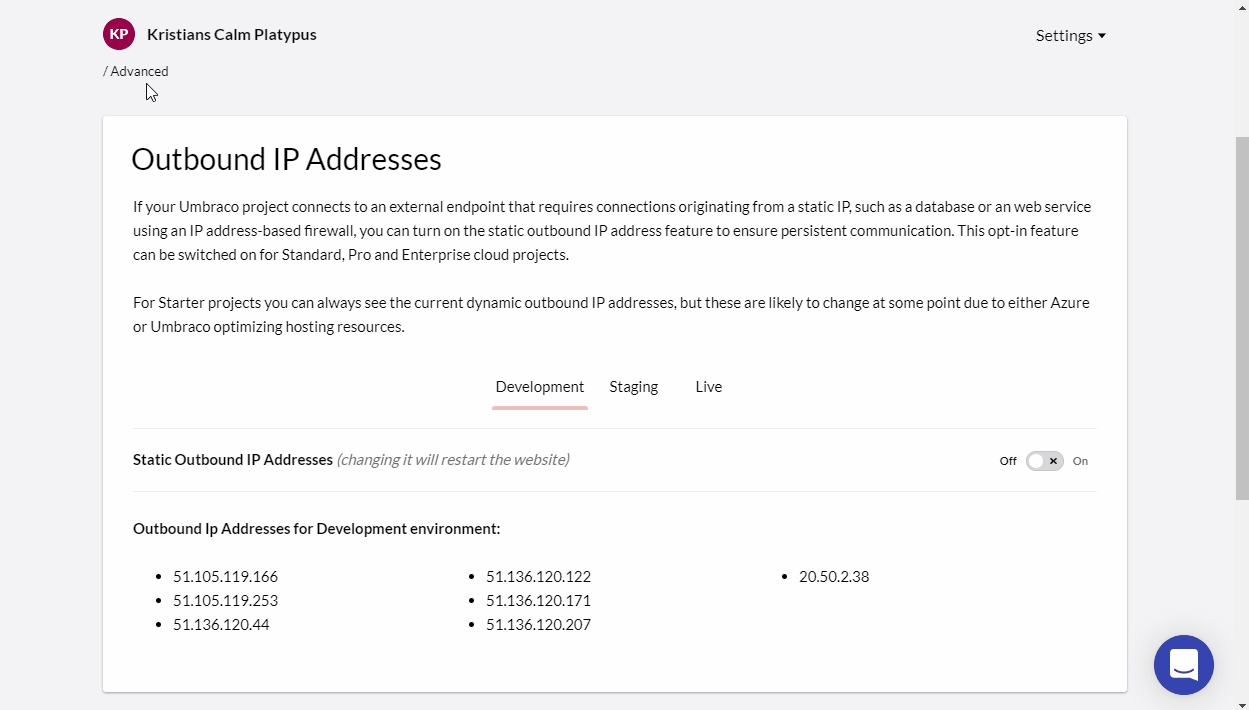 On the Advanced page of your project, you can turn on the static outbound IP address feature to ensure persistent communication. This opt-in feature can be switched on for Standard, Professional, and Enterprise Cloud projects.