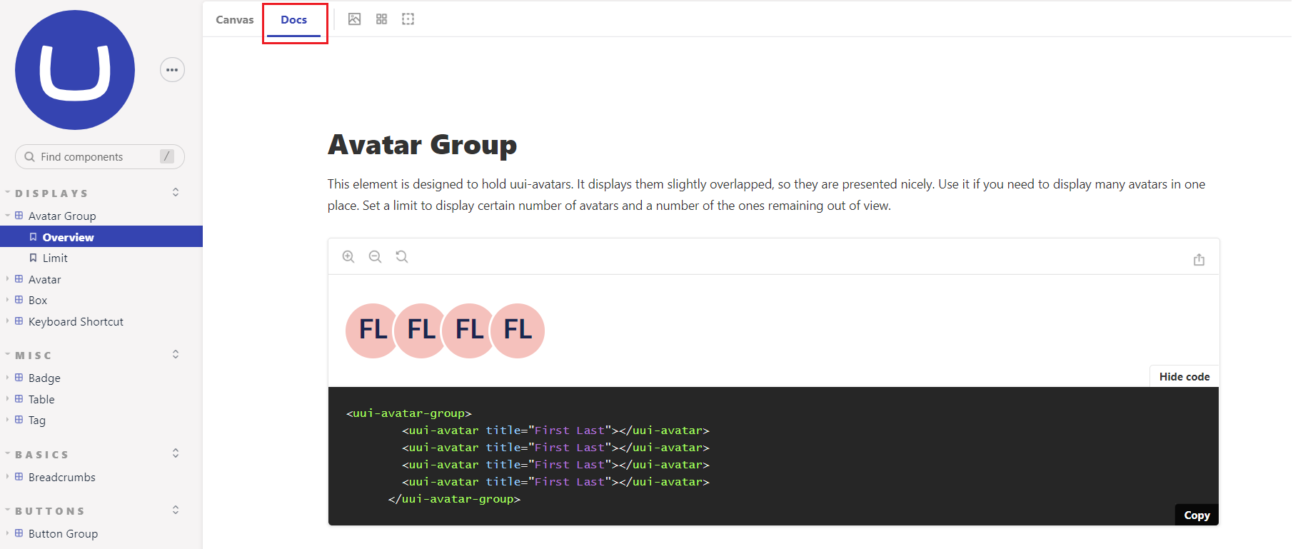 The [Storybook](https://uui.umbraco.com/) is the starting point for working with the Umbraco UI Library. The Storybook contains two tabs: