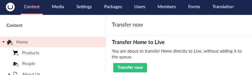 **Transfer now** is available in all Umbraco Cloud projects running the latest version of Umbraco Deploy for Umbraco versions 8 and 9.