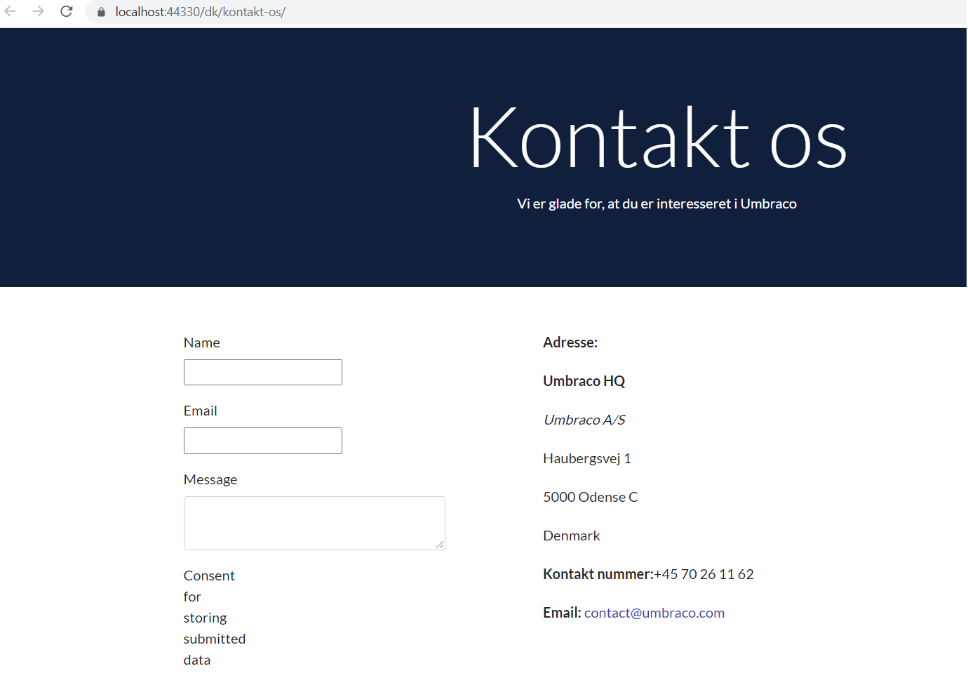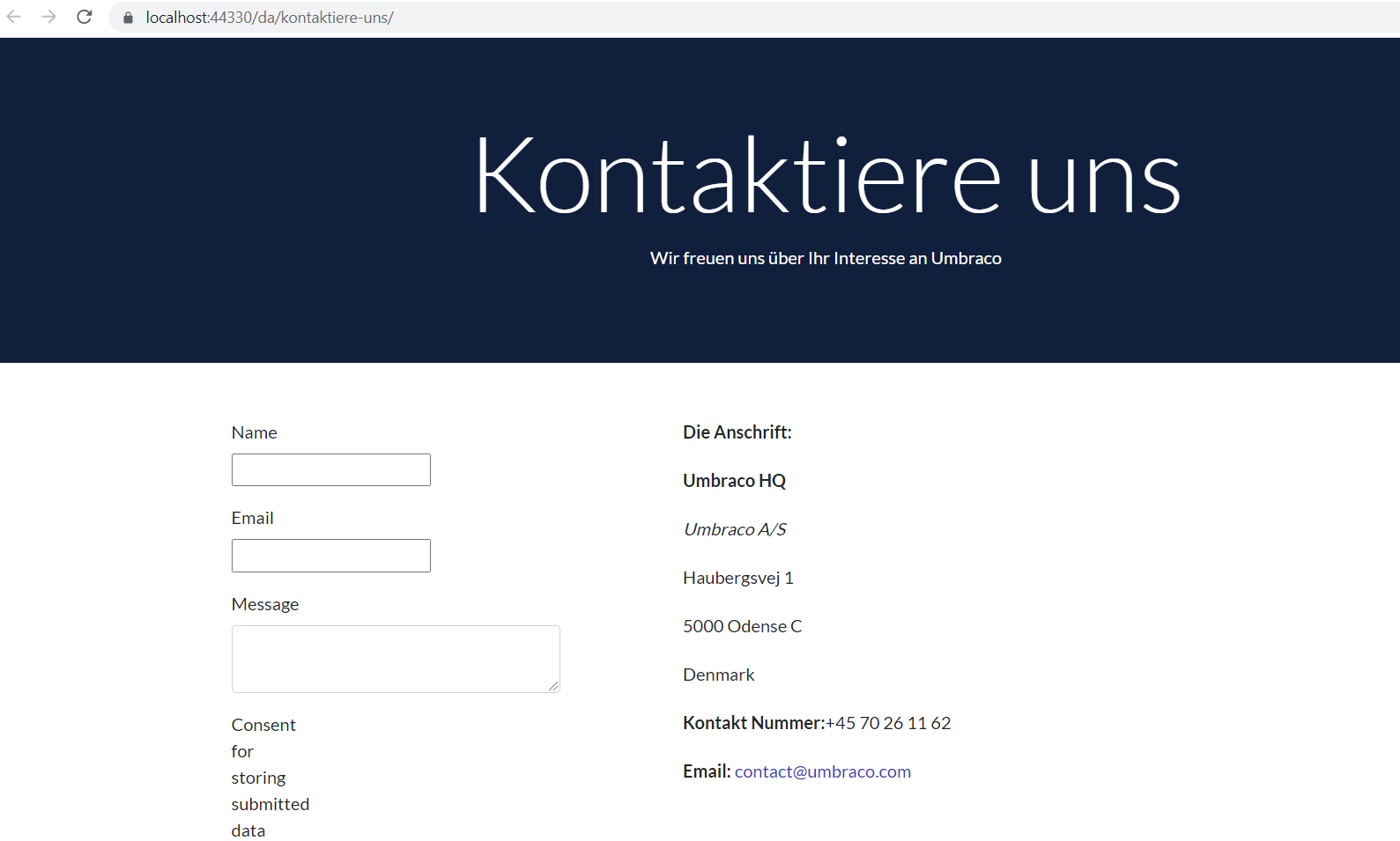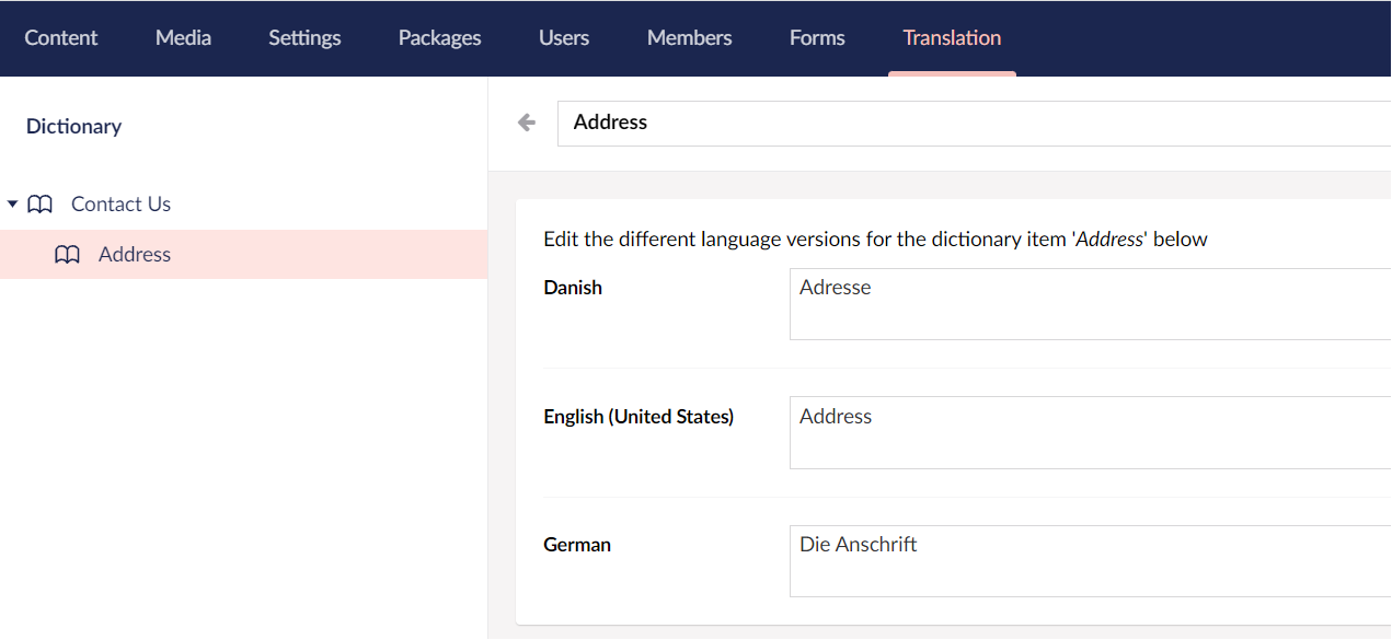 Depending on how your site is set up, not all content is edited through the content section. Some of the content may be written in the template or labels of the content node and dictionary items can play a part here. Dictionary items store a value for each language. They have a unique key and can be managed from the **Translation** section. For this tutorial, let's add dictionary items for the **Address** and **Contact Number** labels of the Contact Us page.