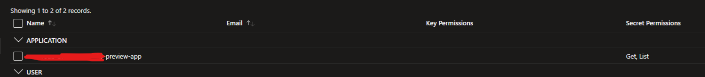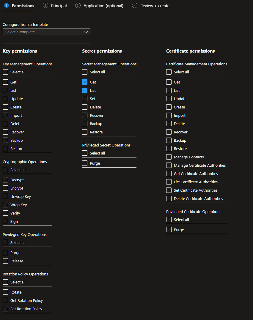 You will now be presented with different permissions to set for your Web App. You only need Get and List for Secret Permissions only. Click Next to continue: