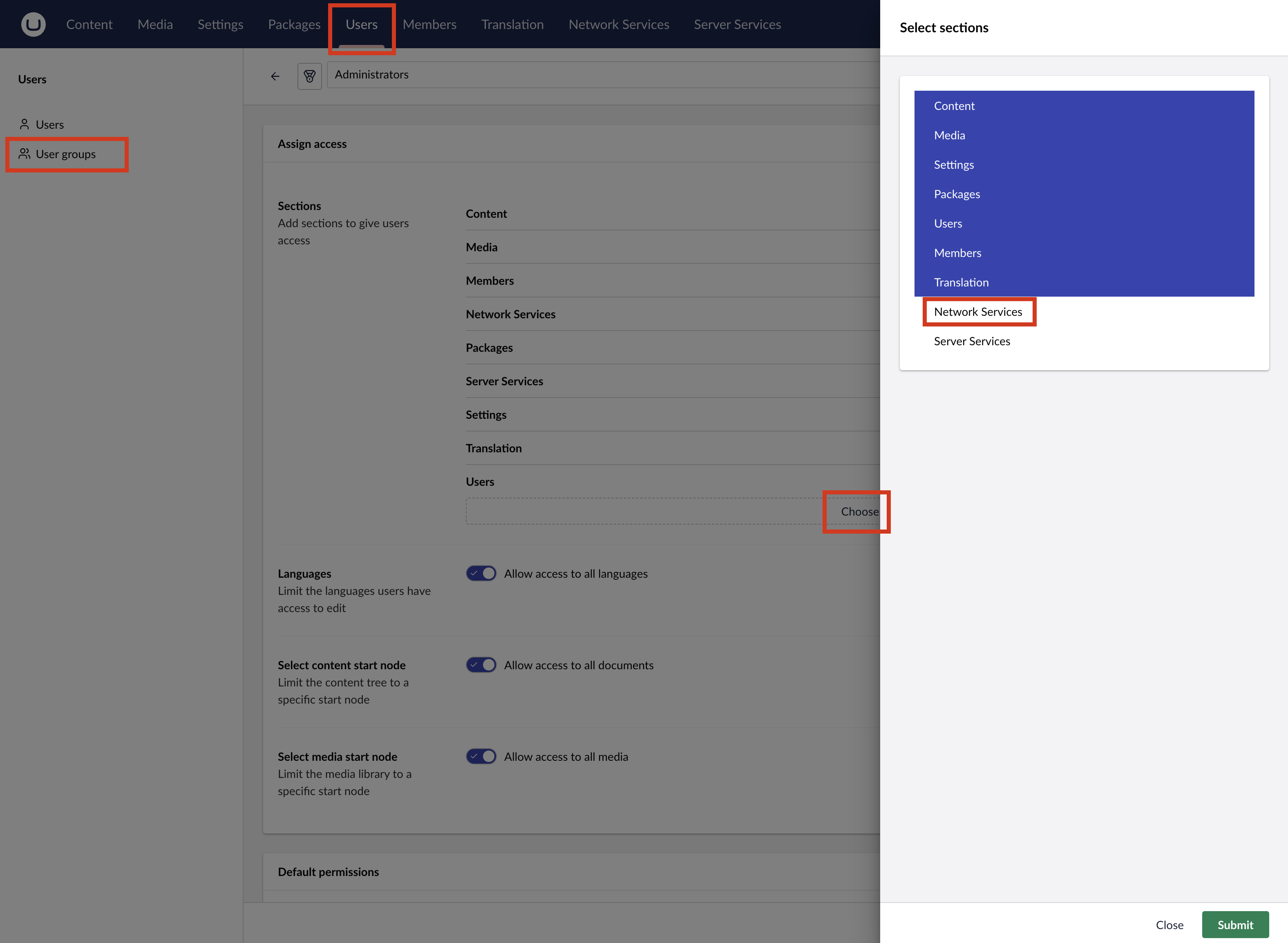To grant access to the custom section, open the Umbraco backoffice, navigate to the **Users** section, and select the **User groups** menu item. Site administrators can create a new user group or modify an existing one.