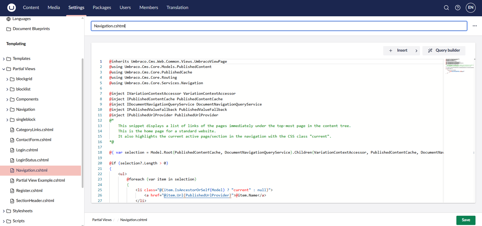 You can create and edit partial views from the **Partial Views** folder in the **Settings** section of the Backoffice.