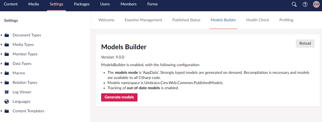 Models Builder ships with a dashboard in the Settings section of Umbraco's backoffice. The dashboard does three things: