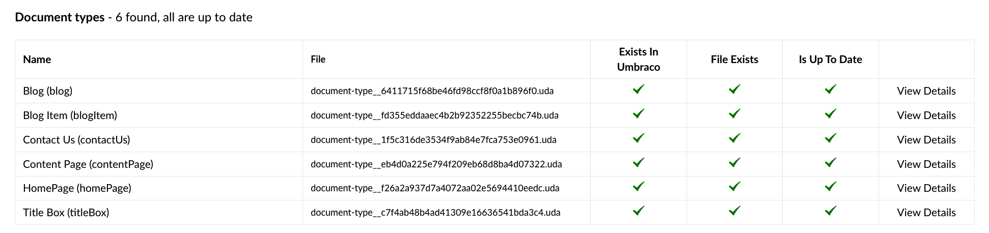 Running this operation will update the Umbraco Schema based on the information in the `.uda` files on disk.