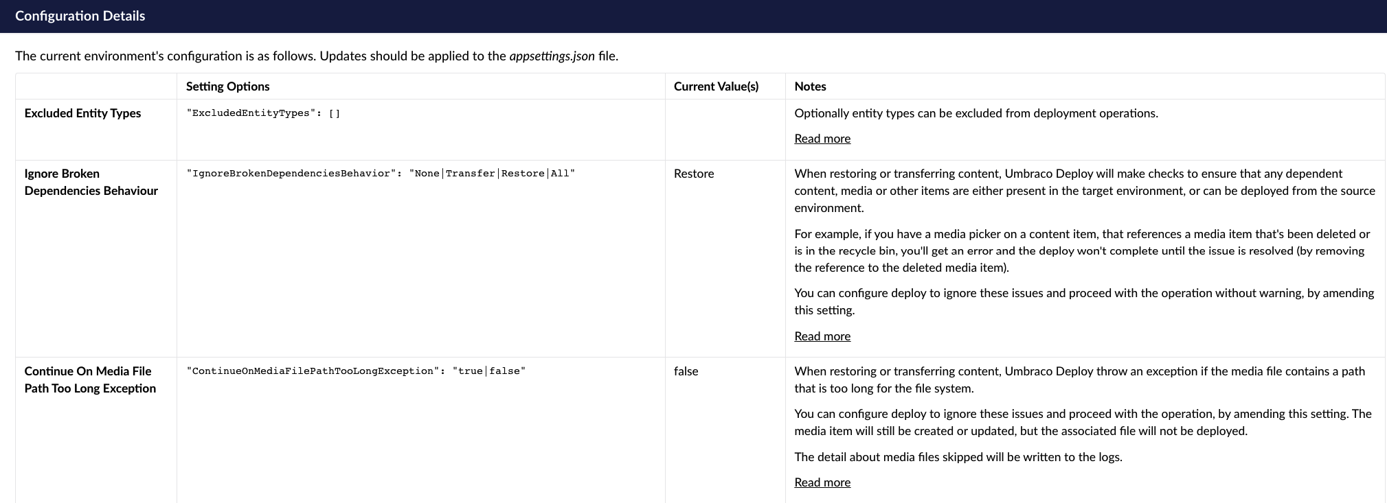In the Configuration details, you can see how Umbraco Deploy has been [configured](https://docs.umbraco.com/umbraco-deploy/getting-started/deploy-settings) on your environment. You get an overview of the Setting options, the current value(s), and notes help you understand each of the settings. Updates to the need to be applied in the `appsettings.json` file.