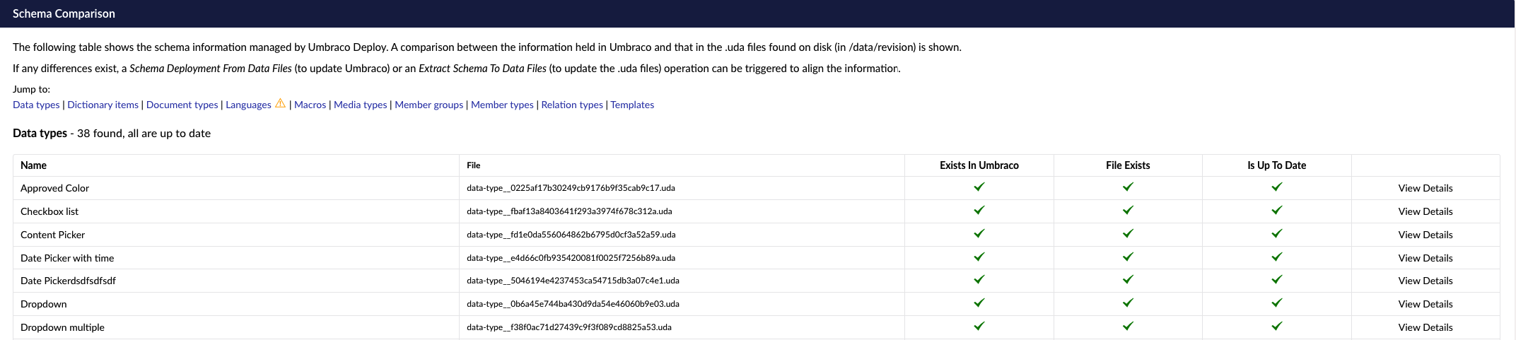 You can see a comparison between the information that is held in Umbraco and the information in the `.uda` files on disk.