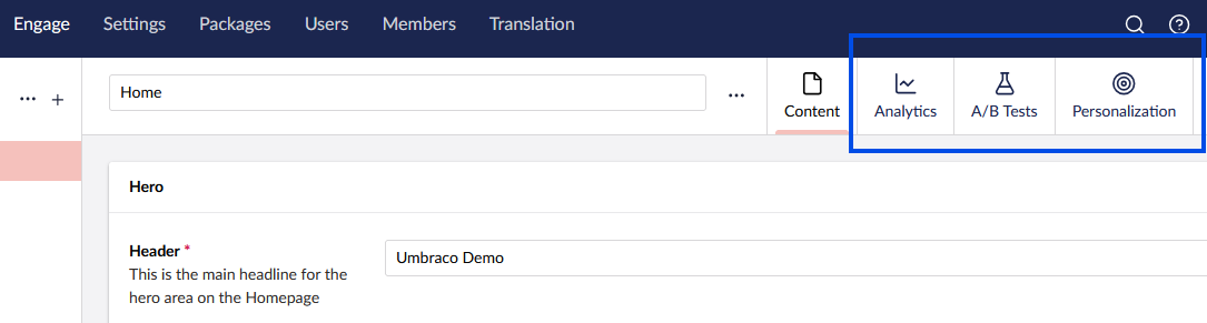 After logging in to Umbraco, you can see the Engage section next to the other main sections in the Umbraco backoffice.