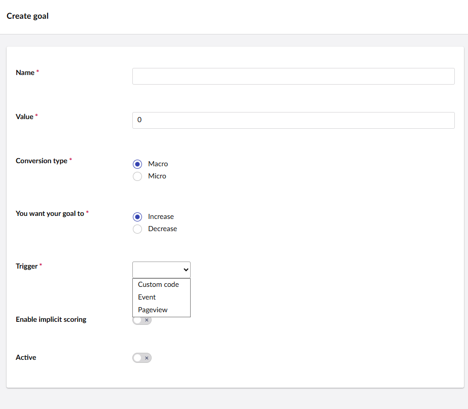 When you click on **Create new goal** you can set up a new goal. You have to give it a name and an optional goal value.