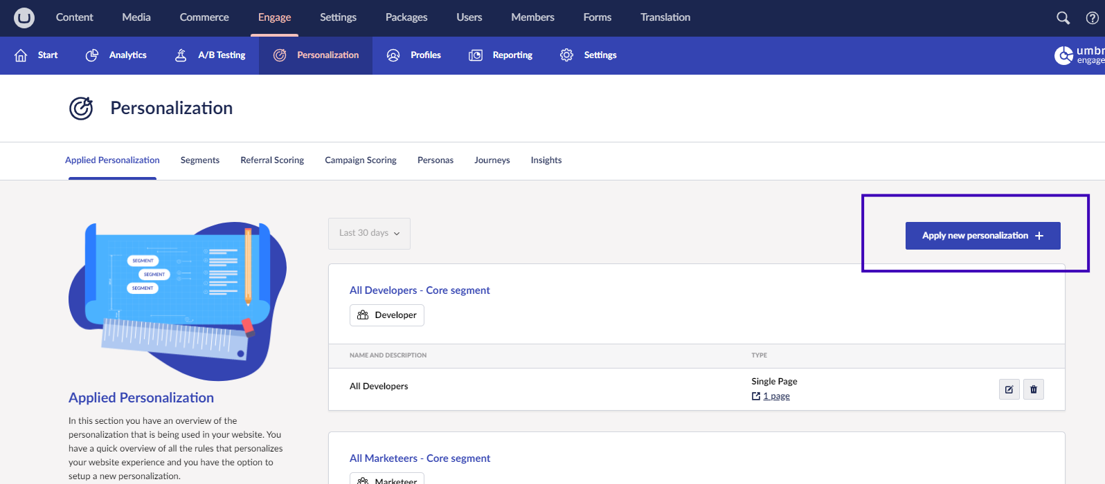 1. Navigate to **Engage -> Personalization -> Applied Personalization**.