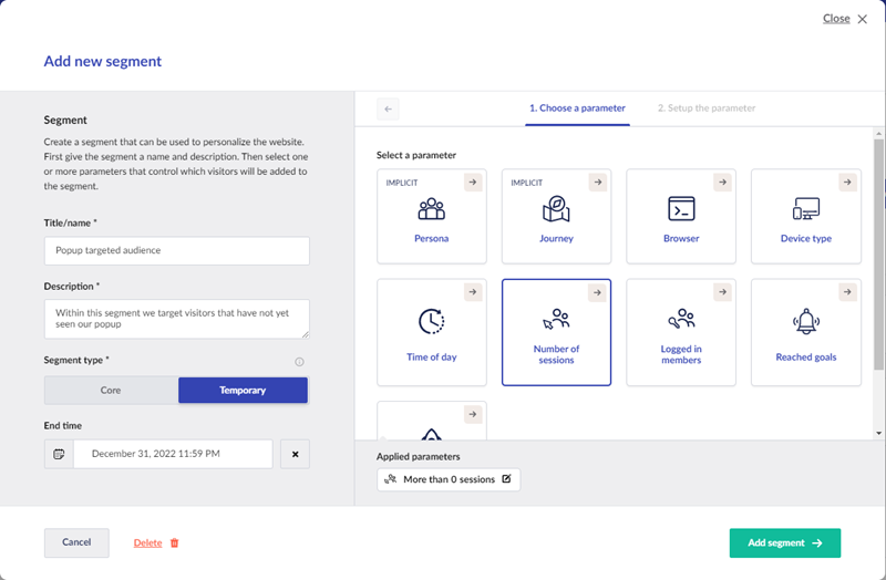 9. Select **Number of sessions** in **Choose a parameter** tab.