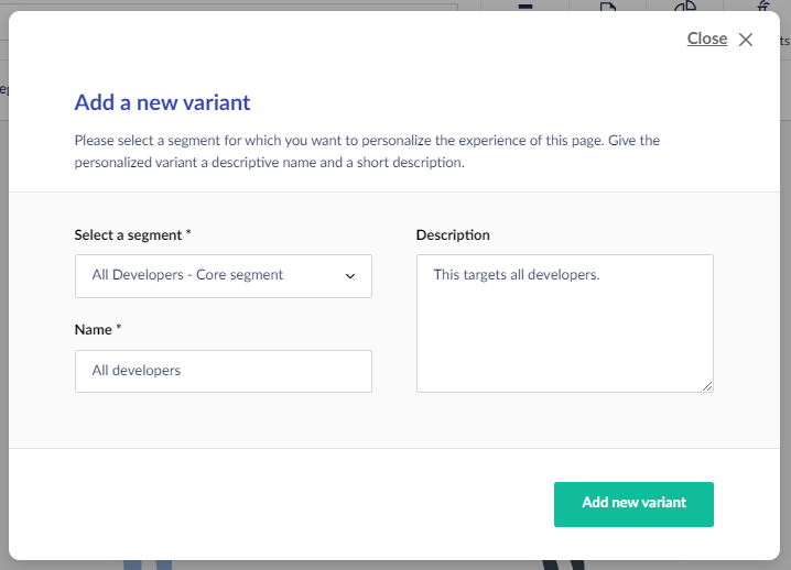 <figure><img src="https://1498851568-files.gitbook.io/~/files/v0/b/gitbook-x-prod.appspot.com/o/spaces%2FeiQnEGdbGIoA0IQ3nJUK%2Fuploads%2Fgit-blob-22a041fb3f1a434ac2e519d5c3bc9d7c66dd45c3%2Fengage-personalization-add-new-variant.png?alt=media" alt=""><figcaption><p>To add a new personalization variant you need to select a segment and add a name and a description.</p></figcaption></figure>
