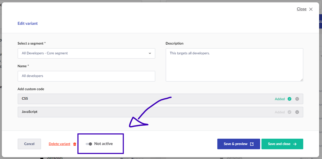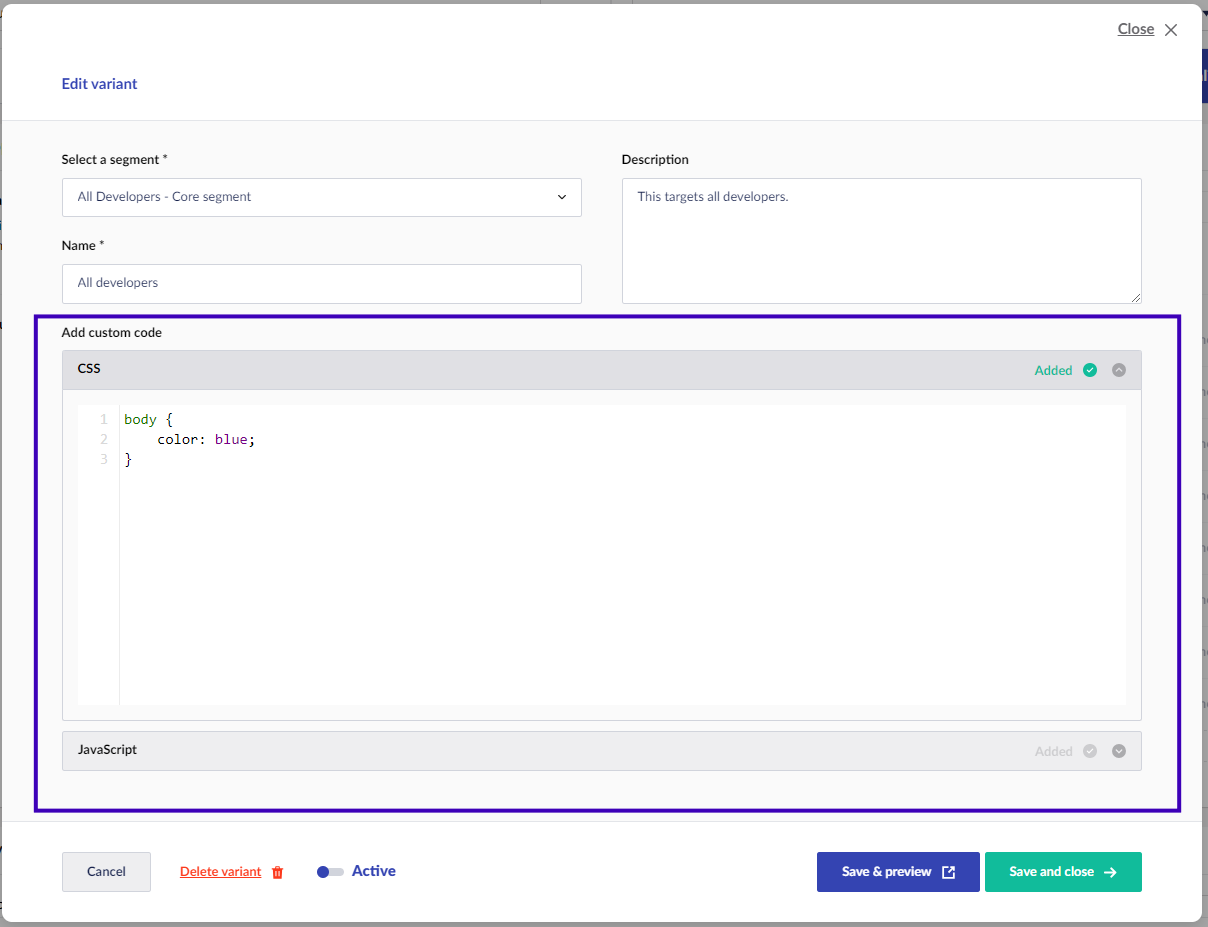 After setting up a personalized variant of a content item, you can add custom CSS and JavaScript. Follow the steps below to learn how.