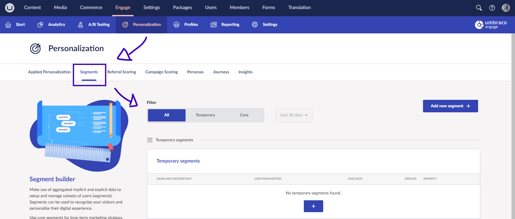 <figure><img src="https://1498851568-files.gitbook.io/~/files/v0/b/gitbook-x-prod.appspot.com/o/spaces%2FeiQnEGdbGIoA0IQ3nJUK%2Fuploads%2Fgit-blob-44d70848a87d8729159bd025933d9e27a5726712%2Fengage-personalization-segments.png?alt=media" alt=""><figcaption><p>Create segments from the Personalization dashboard in the Umbraco Engage section of the backoffice.</p></figcaption></figure>