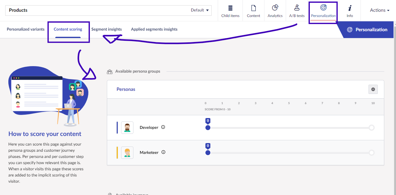 With the Persona groups and Personas in place, it is time to evaluate and score your content for each persona. Giving content a high score for a persona means that this content is especially relevant for that persona. By scoring your content, you will be able to find the true intention of your visitor. [Learn more about content scoring in the Personalization section](https://docs.umbraco.com/umbraco-engage/marketers-and-editors/personalization/implicit-and-explicit-personalization/content-scoring).