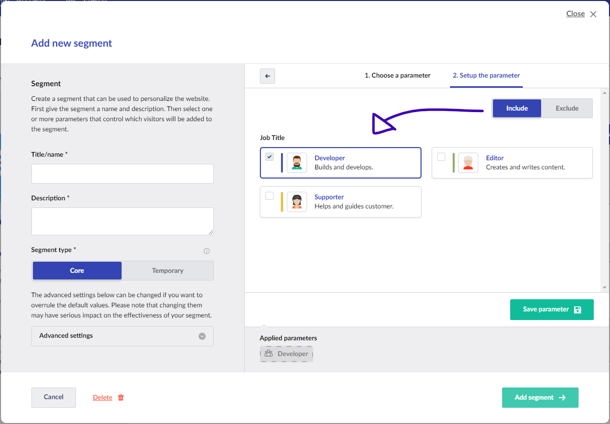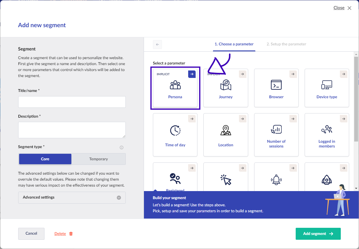 When you have decided which groups to focus on, it is time to build the segments. You segment visitors based on implicit or explicit scoring of their behavior and personas.
