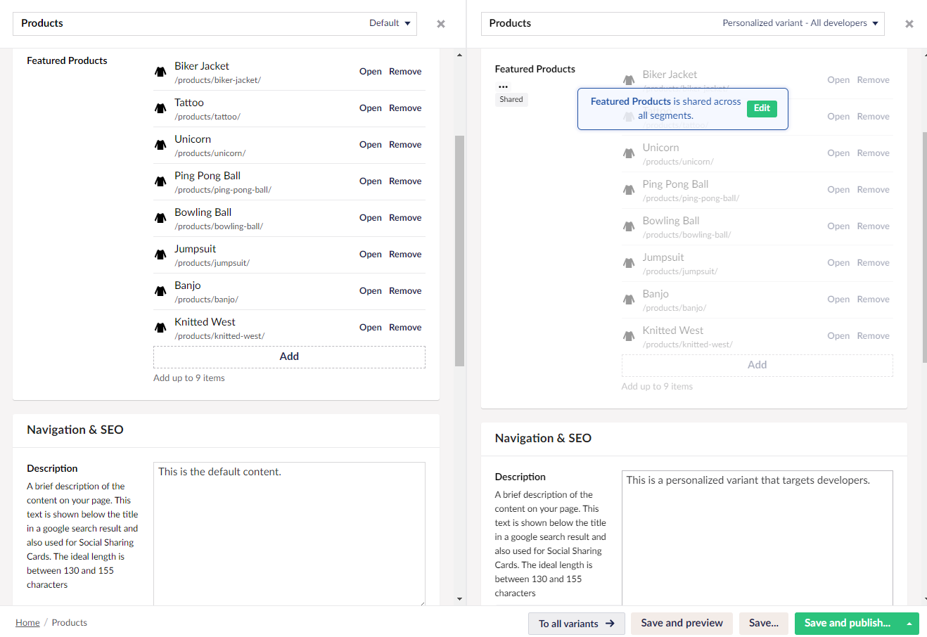 The content opens in a split-view format when all configuration required for the new variant is added. You can add content to the variant while seeing what is currently available by default.