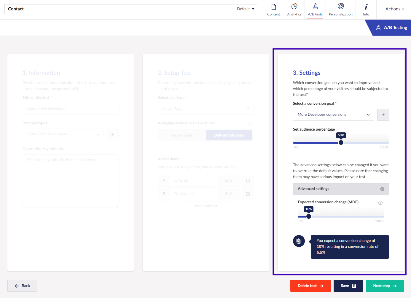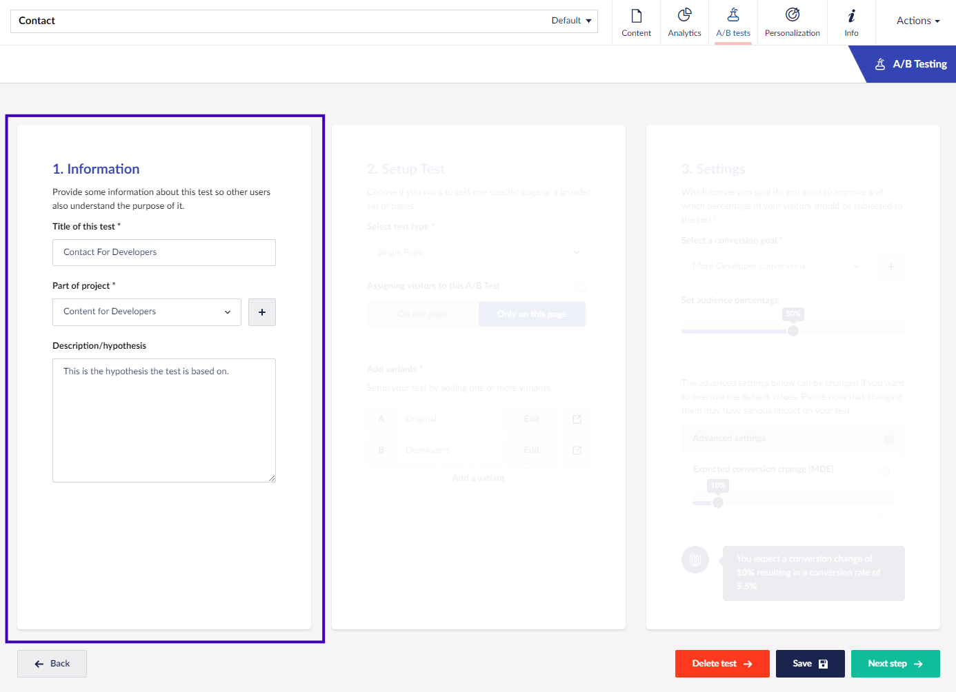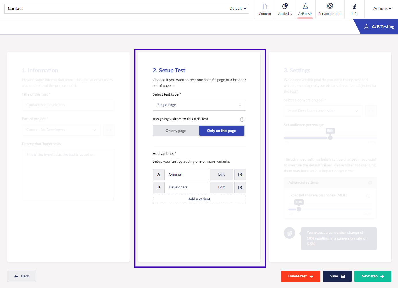 ### Set up a test from the Content section