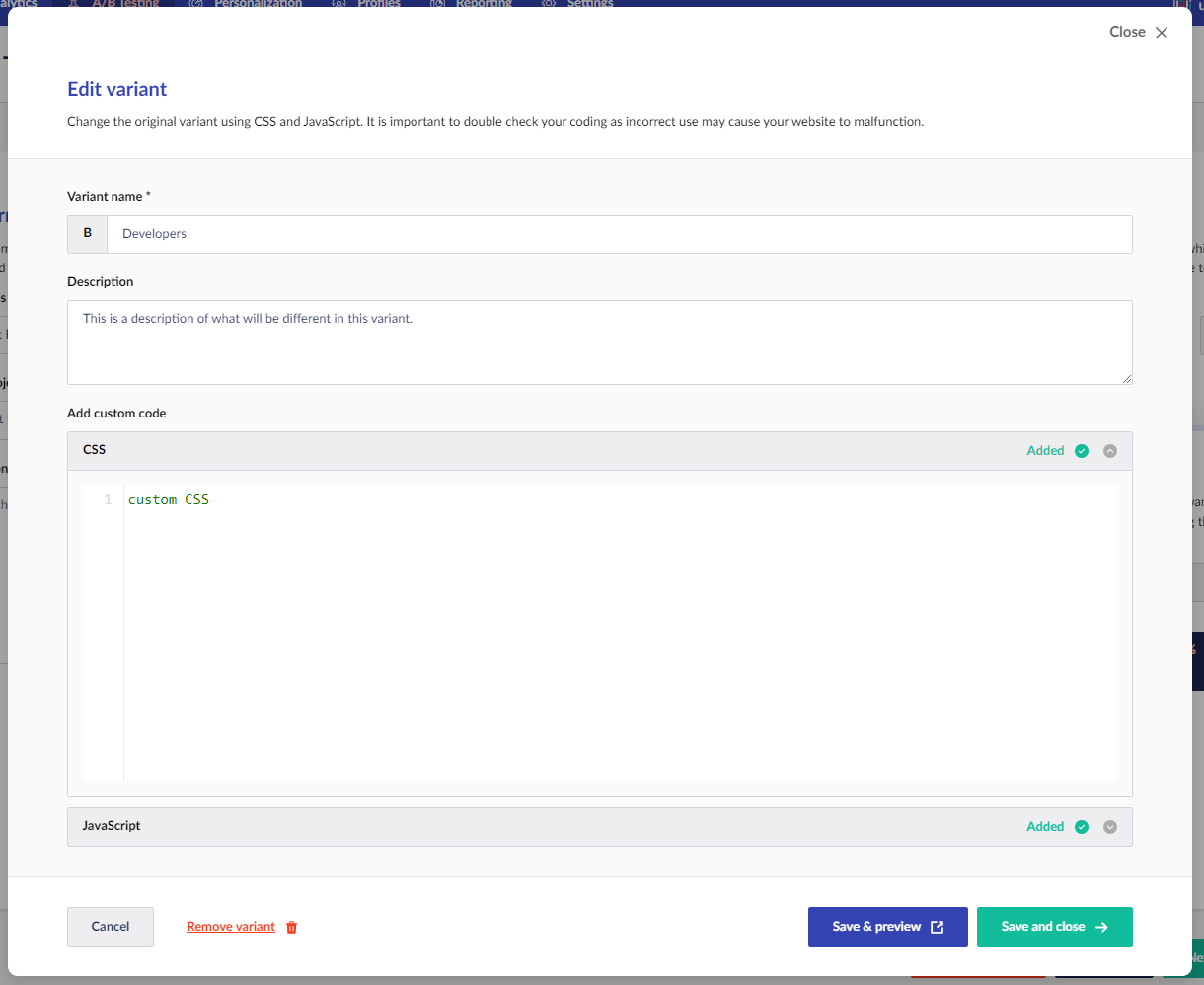 <figure><img src="https://1498851568-files.gitbook.io/~/files/v0/b/gitbook-x-prod.appspot.com/o/spaces%2FeiQnEGdbGIoA0IQ3nJUK%2Fuploads%2Fgit-blob-84d6a1ded2f04a6c62c571d31722d684575c53f9%2Fengage-a-b-test-edit-variant-content-customcode.png?alt=media" alt=""><figcaption></figcaption></figure>