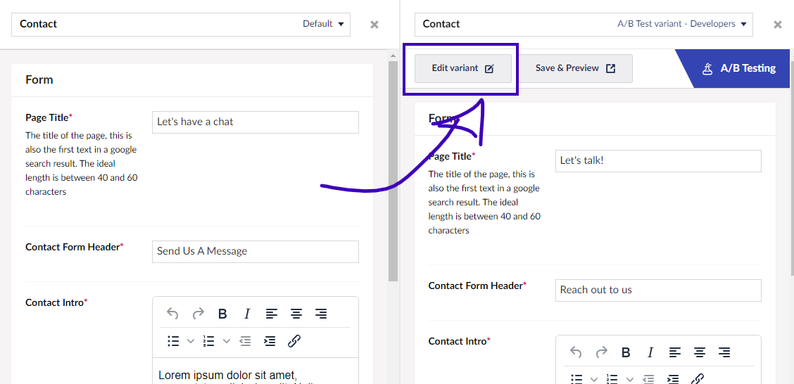 5. Click on the **Edit variant** button below the Page Title.