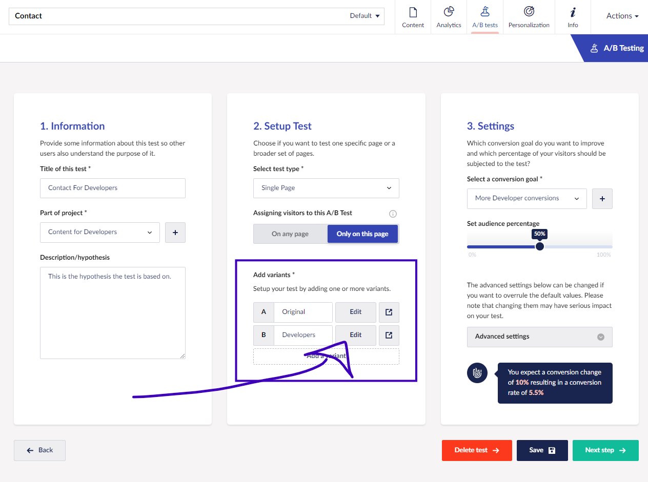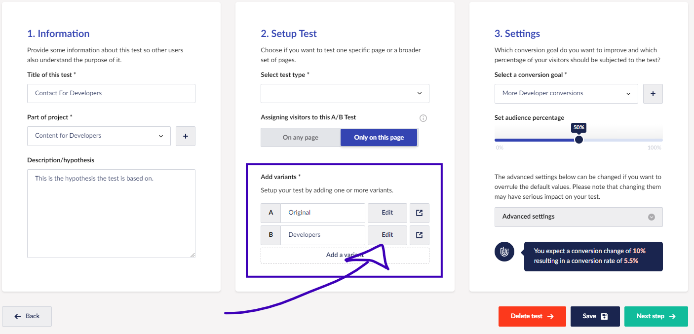 Once you have confirmed your website is eligible for testing and defined a clear hypothesis and objective, you are ready to set up the test.