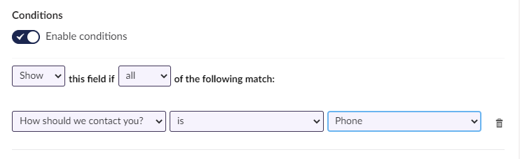 In this example, we only want to show the **Phone** field if the value of the **How should we contact you** field is `Phone`.