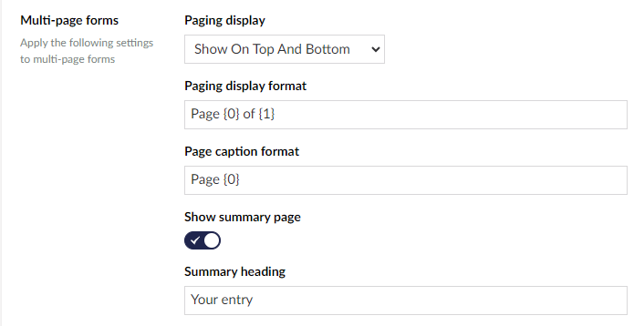 | **Show summary page**     | Select whether a summary page is displayed at the end of multi-page forms, where a user can review their entry before submitting.                                                                              |